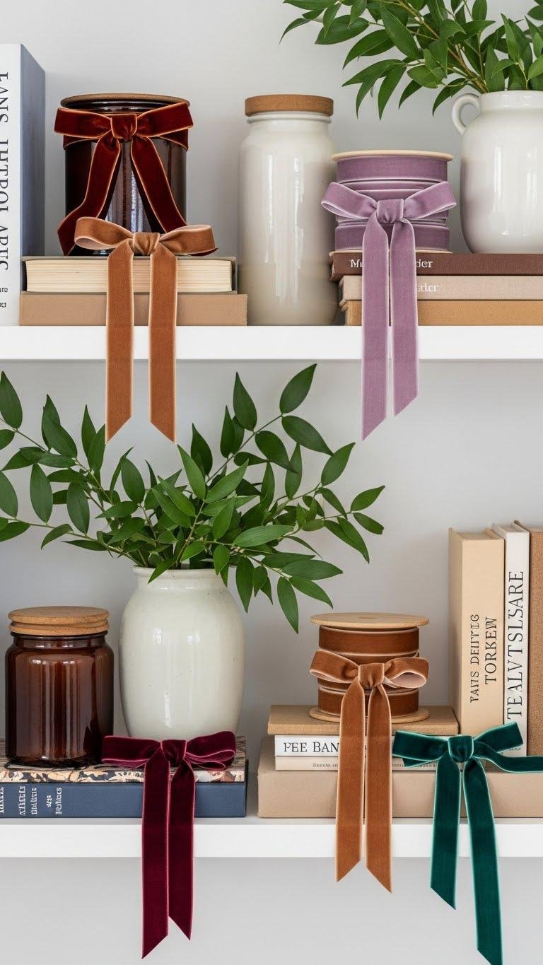 Drape velvet ribbon loosely or tie neat bow accents on books, jars, or greenery to create calm structure. You’ll balance texture with negative space, letting each bow breathe so the arrangement feels intentional, liberated, and quietly luxurious.