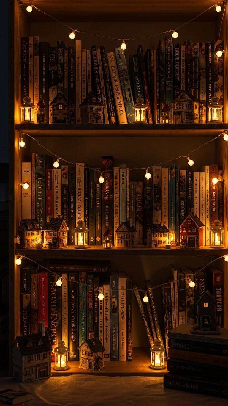 Tuck a strand of warm fairy lights into a cozy book nook to make the shelf feel intimately lit and inviting; the tiny bulbs spill a soft, golden glow across spines and paper edges, turning reading time into a quiet ritual.