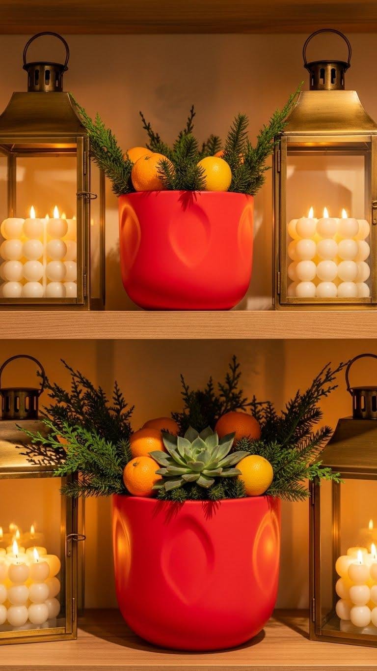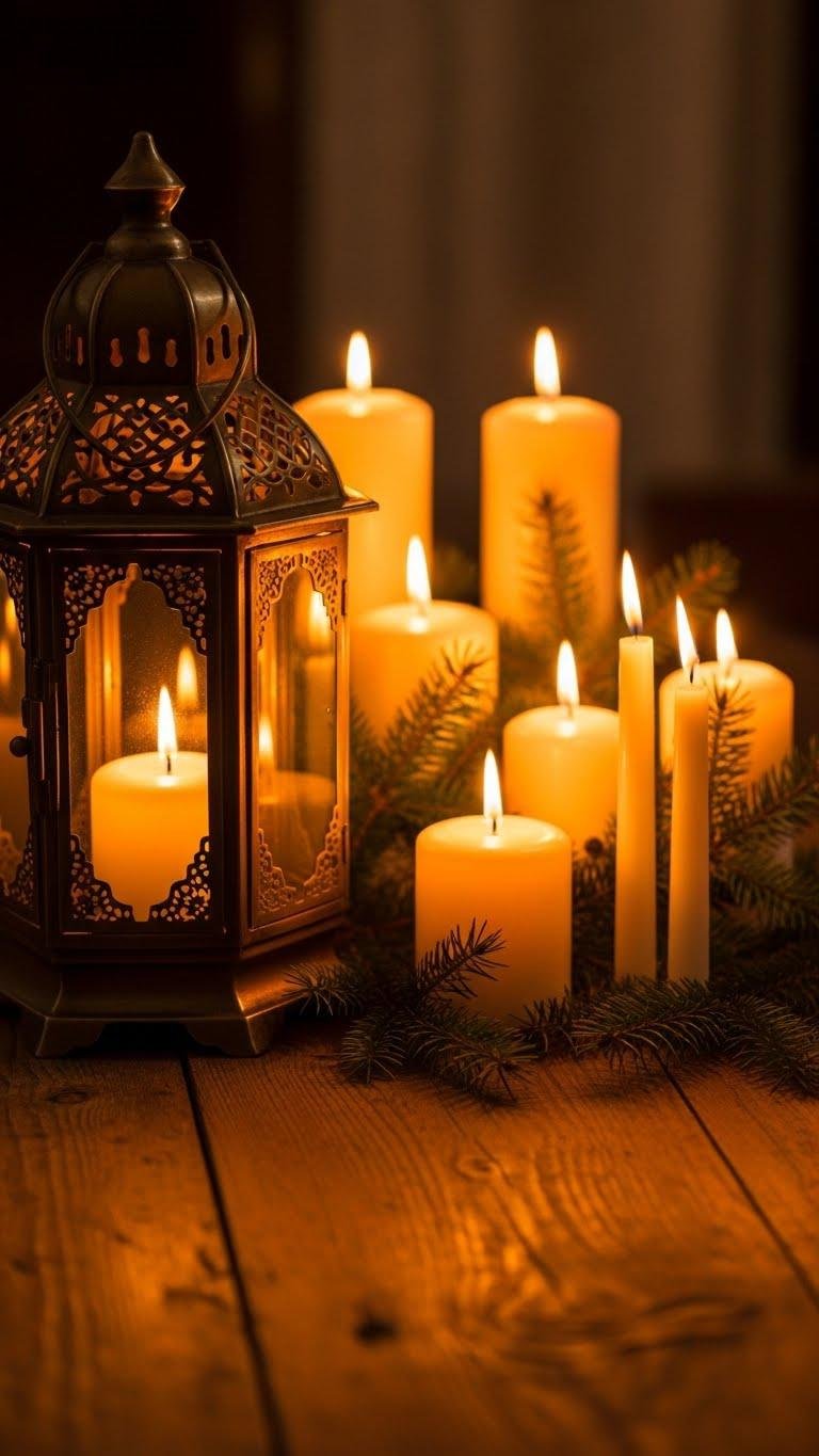 Usually, you’ll balance the soft, flickering warmth of candles with the structured glow of lanterns to create layers of light that feel intentional and inviting. You’ll place an antique brass lantern beside clustered candles, letting soft amber light pool on textured wood. Arrange varying heights, tuck in evergreens for scent, and leave space so the glow breathes—simple, liberated, deliberately calm.