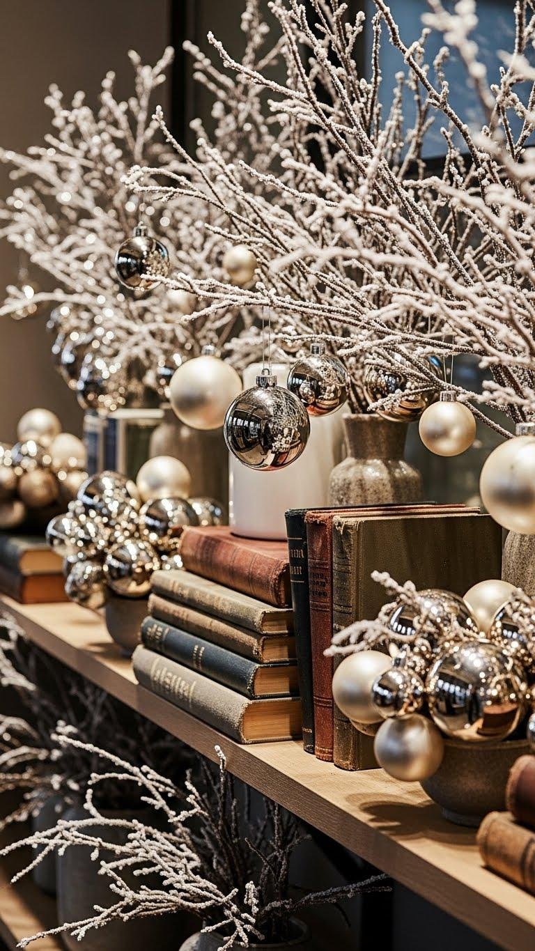 Bring a breath of winter indoors by arranging frosted branches with a mix of glass and matte ornaments across your shelf; the icy texture of the branches contrasts beautifully with the soft sheen of the baubles, and you’ll get an instant sense of seasonal calm.