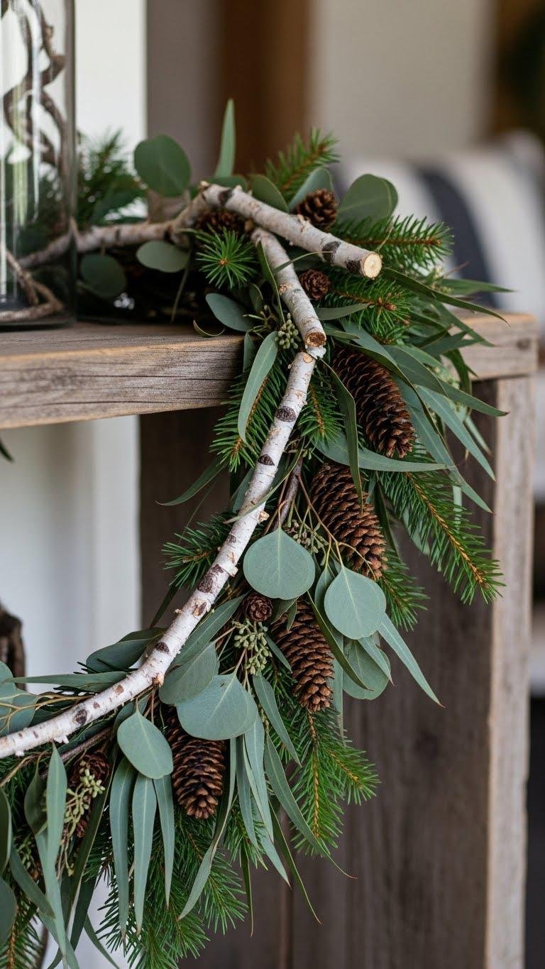 You’ll mix foraged eucalyptus with fir sprigs, tuck birch twigwork amidst pinecones, and let textures speak. Drape it casually over the shelf edge, securing discreetly, so the arrangement breathes and invites effortless, free-spirited living.