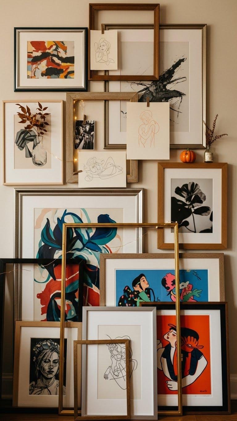 Lean a mix of frames and art against the wall to create depth and a relaxed gallery feel that’s easy to change with the seasons. You’ll balance asymmetrical leaners with varied sizes, textures, and layered matting to keep things tactile and curated. Let a few unframed pieces and metal or wood frames overlap; you’ll enjoy a cohesive, liberated look that’s simple to refresh.
