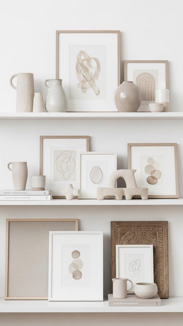 A neutral palette gallery shelf lets you curate a calm, tactile display that feels intentional without fuss. You’ll arrange art, ceramics, and found objects in soft neutrals, mixing scale and negative space to breathe.