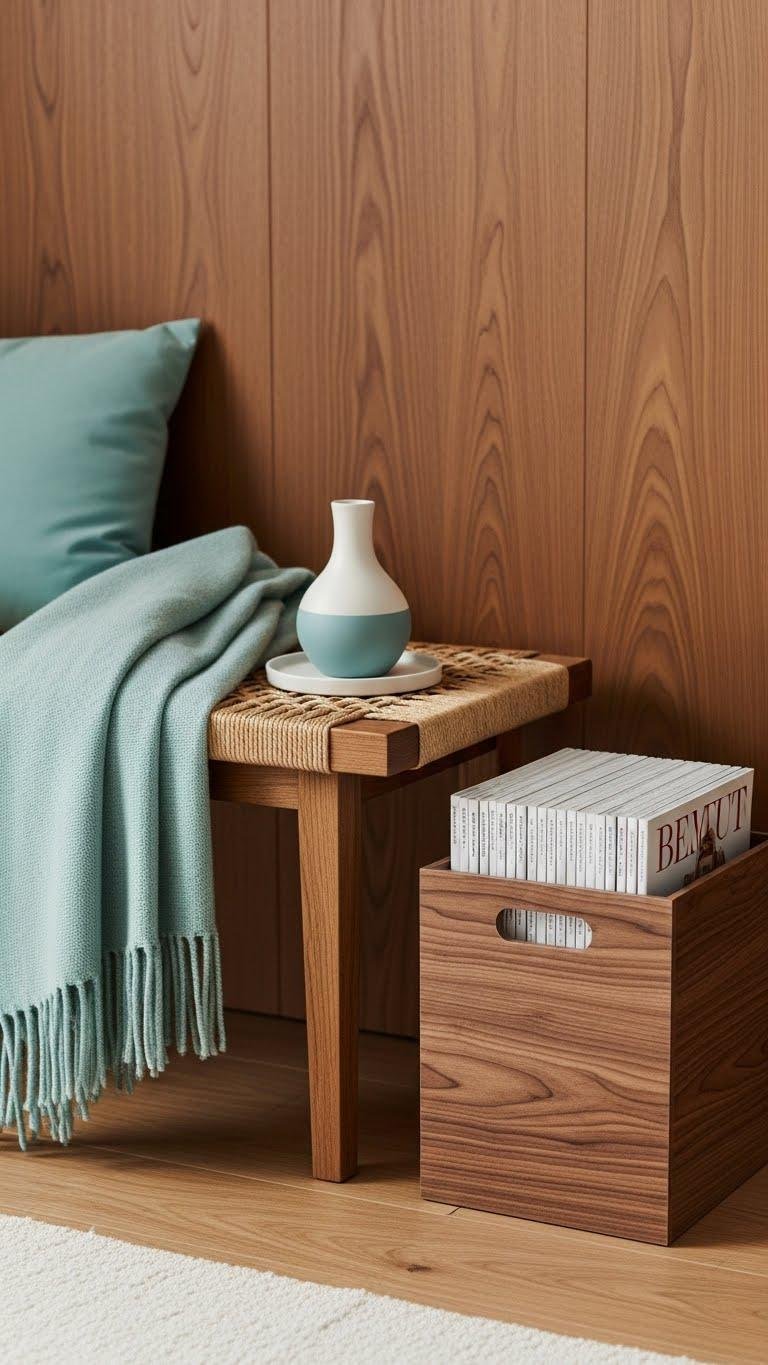 If you want to shift from the muted calm of a neutral gallery shelf, bring in warm wood tones and soft aqua accents to create a cozy corner that still feels curated and calm. You’ll layer a tactile aqua throw over a low bench, nest magazines in a woodgrain basket, add a small ceramic vase, and leave space to breathe—comfortable, intentional, freeing.