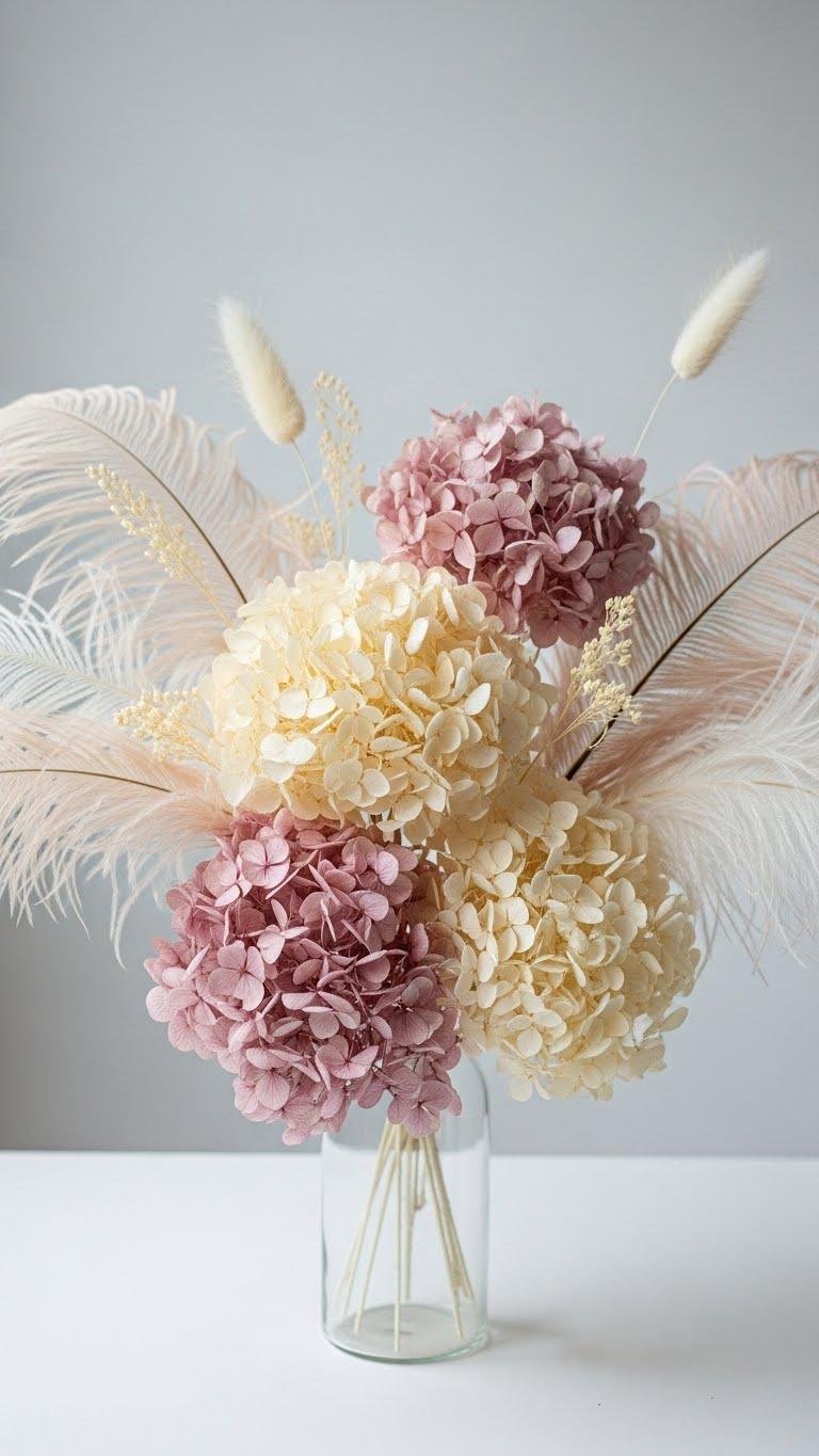 When you repeat clusters of dried hydrangeas alongside soft feather accents, you create a rhythm that feels both refined and comfortably worn; the round, papery blooms balance the light, airy movement of feathers so the eye can settle without fuss. You’ll place pastel hydrangea bunches beside ostrich feathers and feather stems, composing tactile vignettes that feel liberated, deliberate, and effortlessly chic.