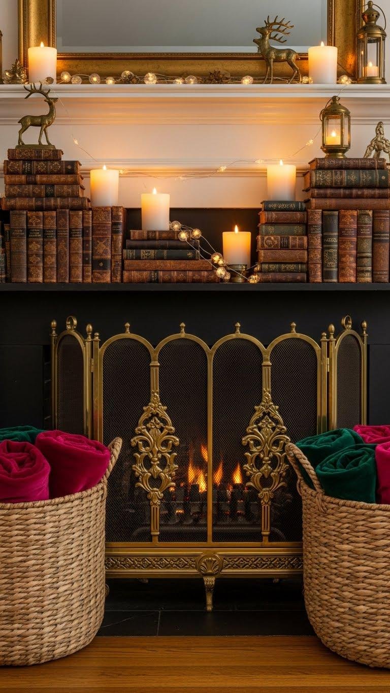You’ll place mantel anchors to create calm mirror symmetry while adding woven baskets, velvet throws, and brass touches for warmth and freedom.