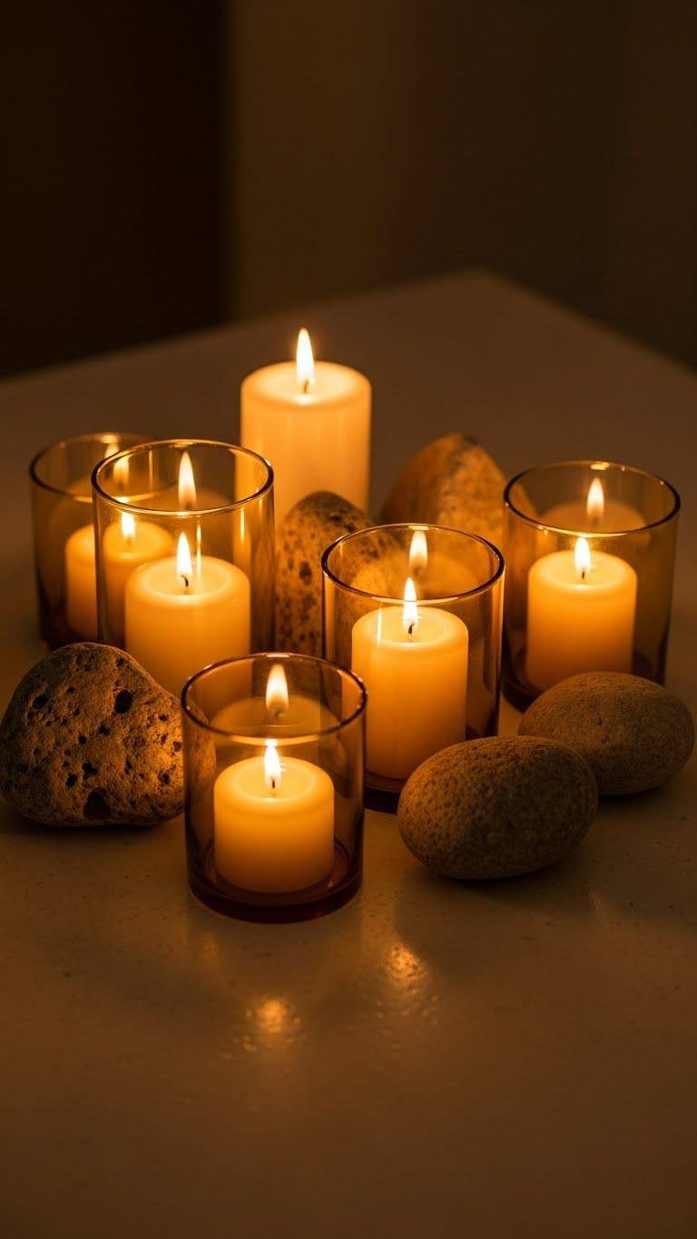 Why not let warm light soften the season’s edges? You’ll place candles with a soft wick in staggered heights, mixing amber glass votives and raw stone for tactile contrast. Lean into negative space, letting flicker define objects rather than crowd them. Arrange freely — a pared, intentional cluster that invites lingering, quiet moments without fuss, elegant and liberating.