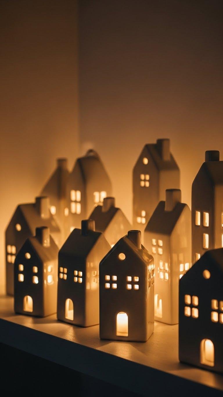 Light a cluster of ceramic house lanterns to give your shelf a warm, cobbled charm that feels both intentional and lived-in. You’ll arrange a tiny ceramic village, varying heights and textures so light filters through delicate lantern silhouettes. Touch matte glazes, balance negative space, and let the glow invite quiet movement—so your display feels effortless, free, and thoughtfully composed.