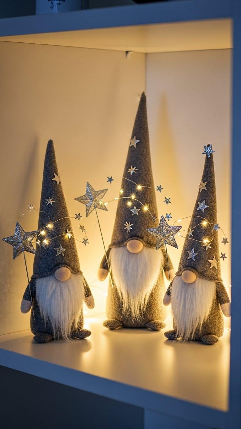 Often you’ll tuck a trio of star-topped gnomes into a corner of the shelf to add a whimsical, textured focal point that still reads refined.