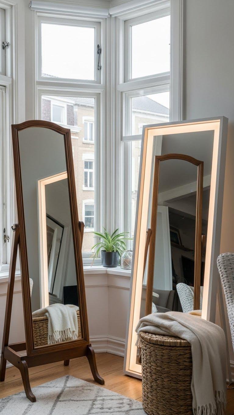 Often you can double the perceived brightness of a small apartment by placing mirrors opposite windows and light sources. You’ll choose pieces that expand sightlines: an antique cheval leans into a corner for vertical drama, while a backlit frameless panel adds soft, even glow.