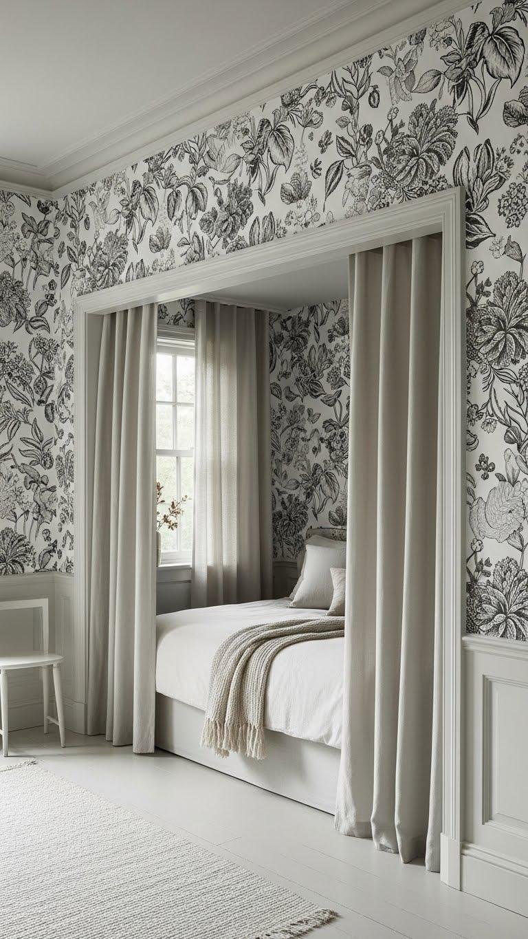 Keeping a pale, unified paint scheme gives you calm foundations—now introduce drama and scale with large-patterned wallpaper or sweeping fabrics to define areas without clutter.