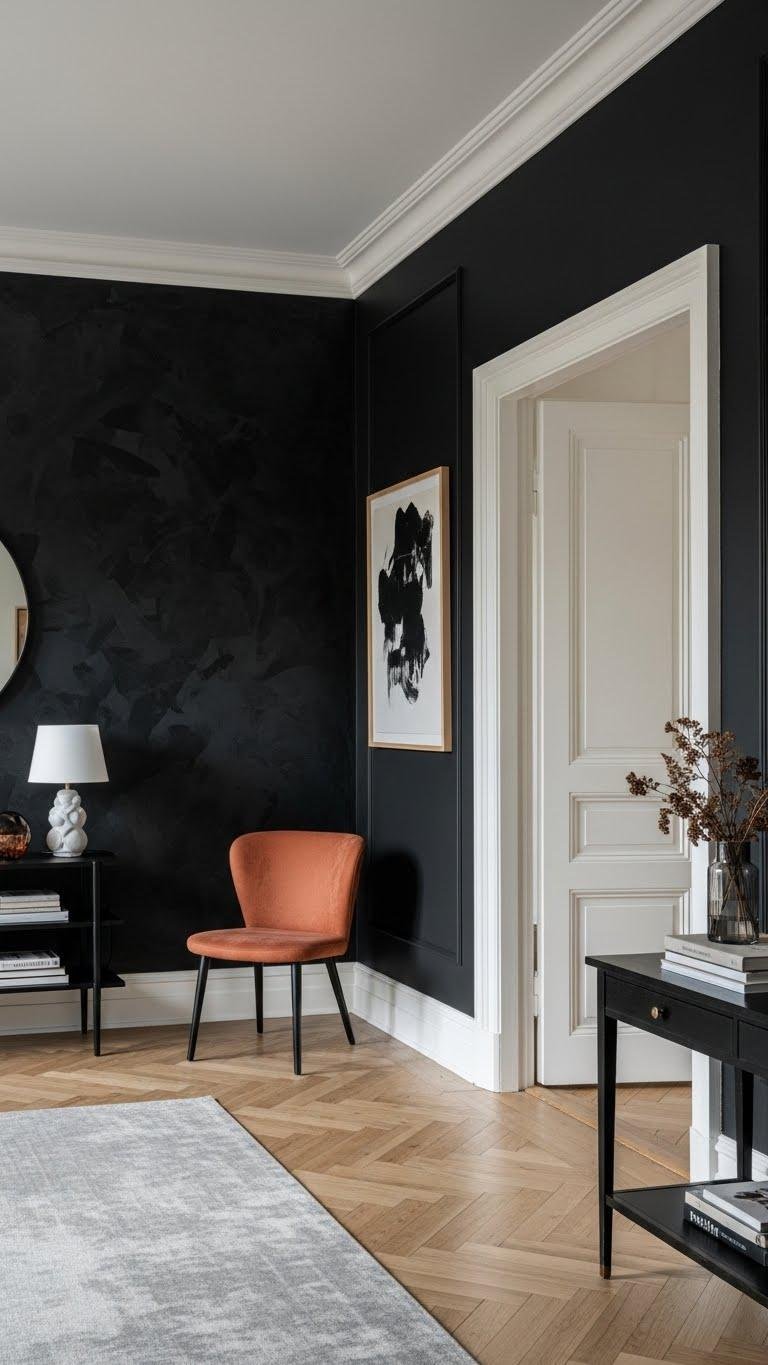 You’ll anchor space with matte black or textured plaster, add contrasting trim to sharpen edges, and hang statement art to focus sightlines.
