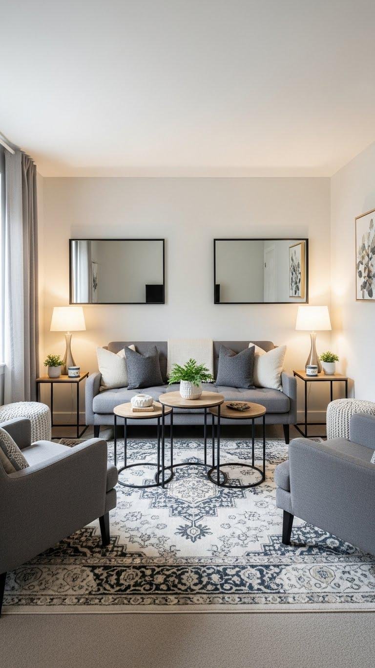 When you arrange furniture symmetrically, you create instant calm and visual order that makes a small space feel intentional and spacious. Use centered symmetry with a focal rug or sofa, flanked by matching chairs or tables. Add mirror pairs to amplify light and depth.