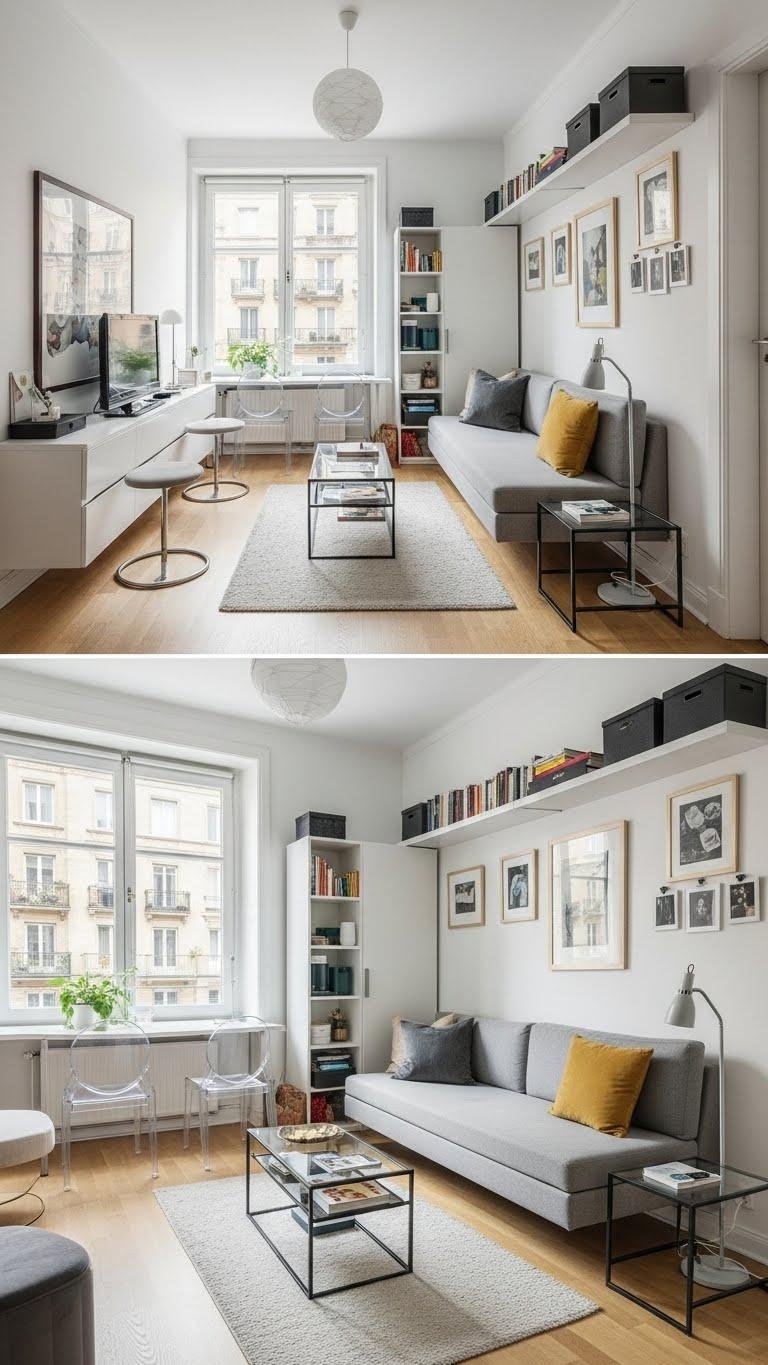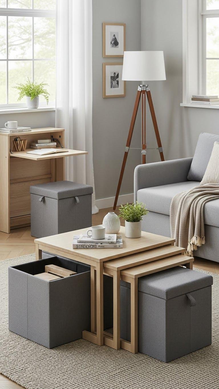 Because space is limited, pick furniture that pulls double duty: a storage ottoman that becomes extra seating and a coffee table, a sofa bed for guests, or nesting tables that expand for entertaining. You’ll want fold out desks for instant work zones and nesting stools that tuck away.