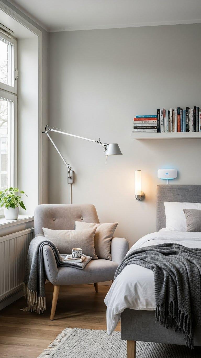 Clear sightlines work hand in hand with lighting: mounting lamps on the wall keeps tabletops and floor space open so lines of sight stay uninterrupted. Choose an adjustable swingarm for reading nooks and a slim sconce by the bed.