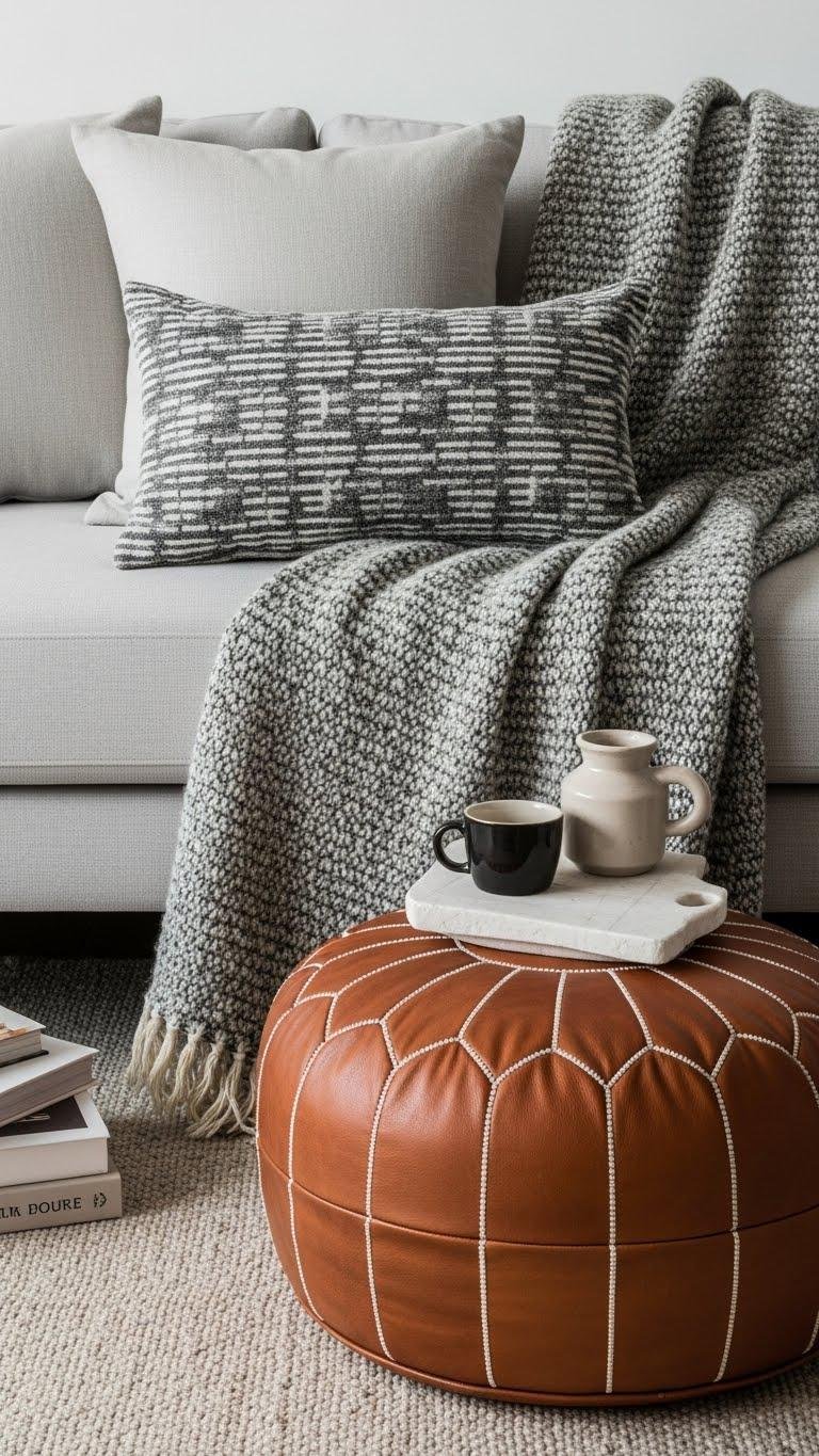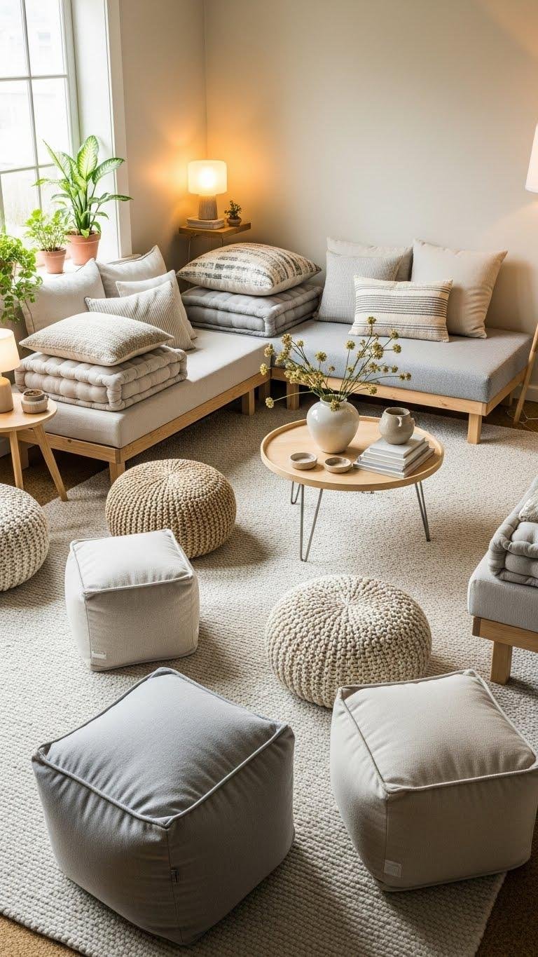 Scatter floor poufs for flexible seating and easy movement. Keep lines clean, legs exposed, and scale low so the room breathes while you stay comfortable and free to rearrange.