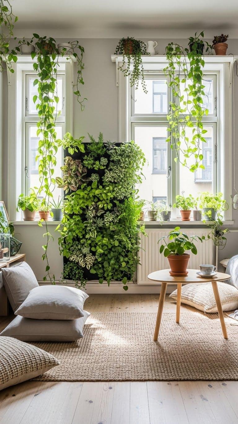 Add a compact living wall, hang trailing vines near windows, and choose natural textiles like linen or jute for cushions and rugs.