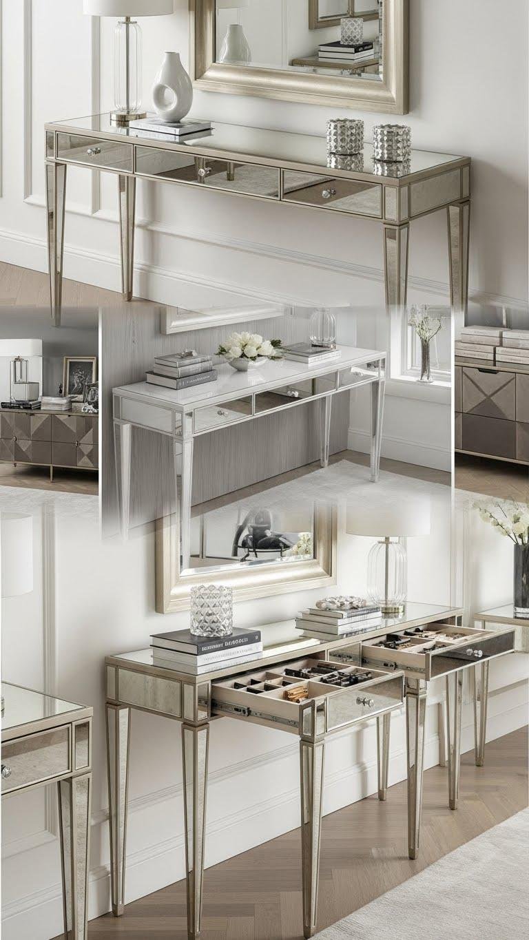 Choose pieces with narrow silhouettes, recessed edges and slender drawers to tuck items away. Mirrored finishes amplify light and depth, so you’ll enjoy a freer, airy room without sacrificing function.