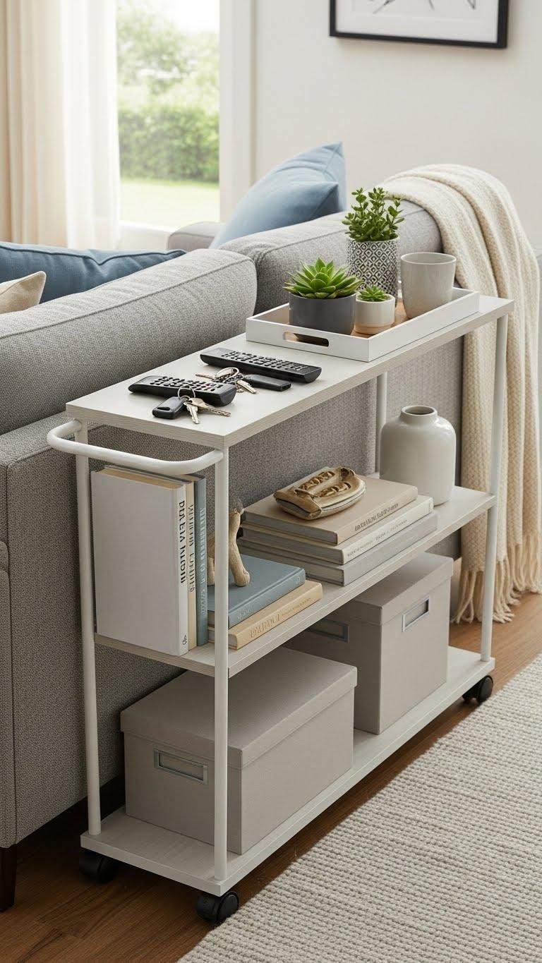 Slide a slim console or rolling cart behind your sofa to reclaim wasted inches for books, remotes, keys, or a tray of plants. Choose a narrow rolling unit or low-profile shelf that glides for cleaning.