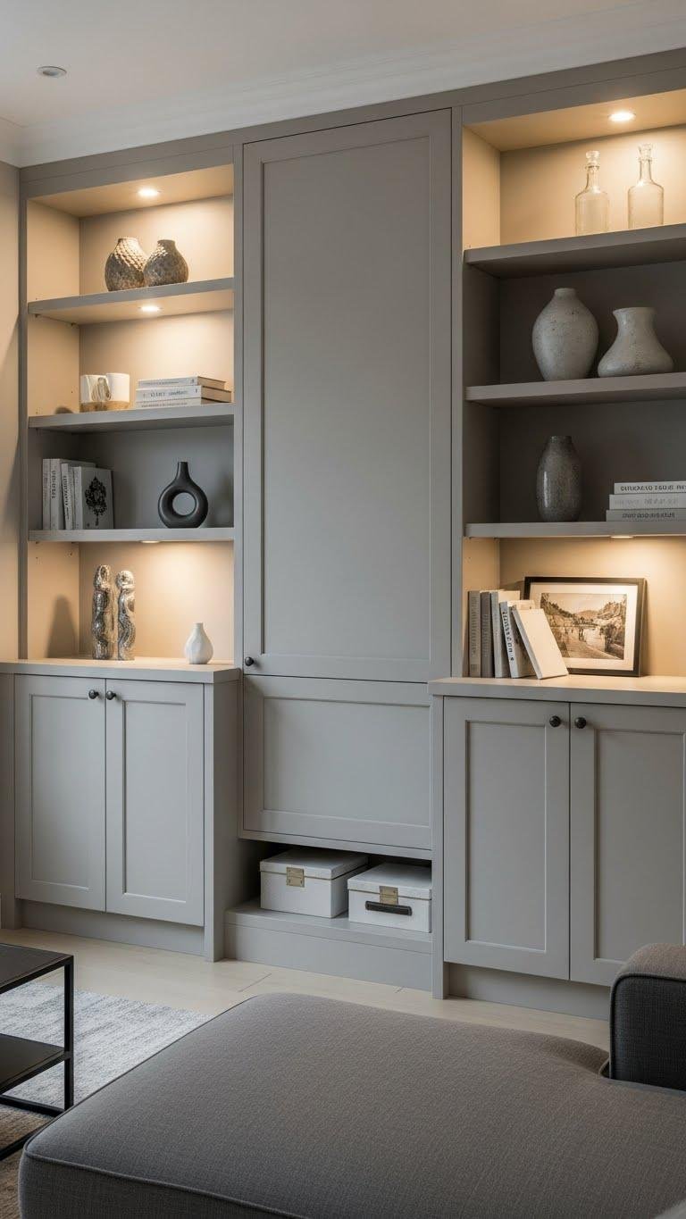 If you liked reclaiming inches behind your sofa, think bigger: built-in cabinets and shelving make walls work harder while keeping the floor clear.