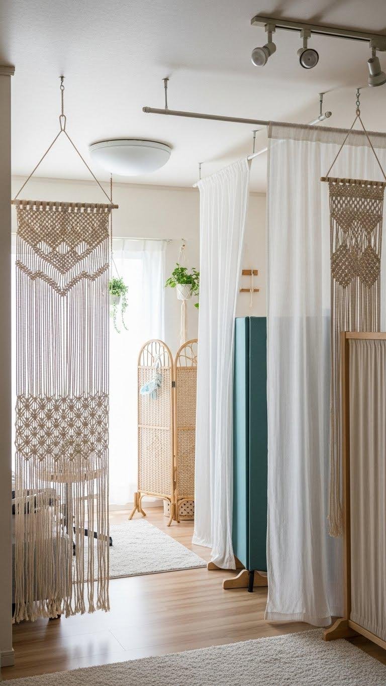 Hang fabric panels or a single wallpapered wall; they add freedom, texture, and visual depth without crowding the floor.