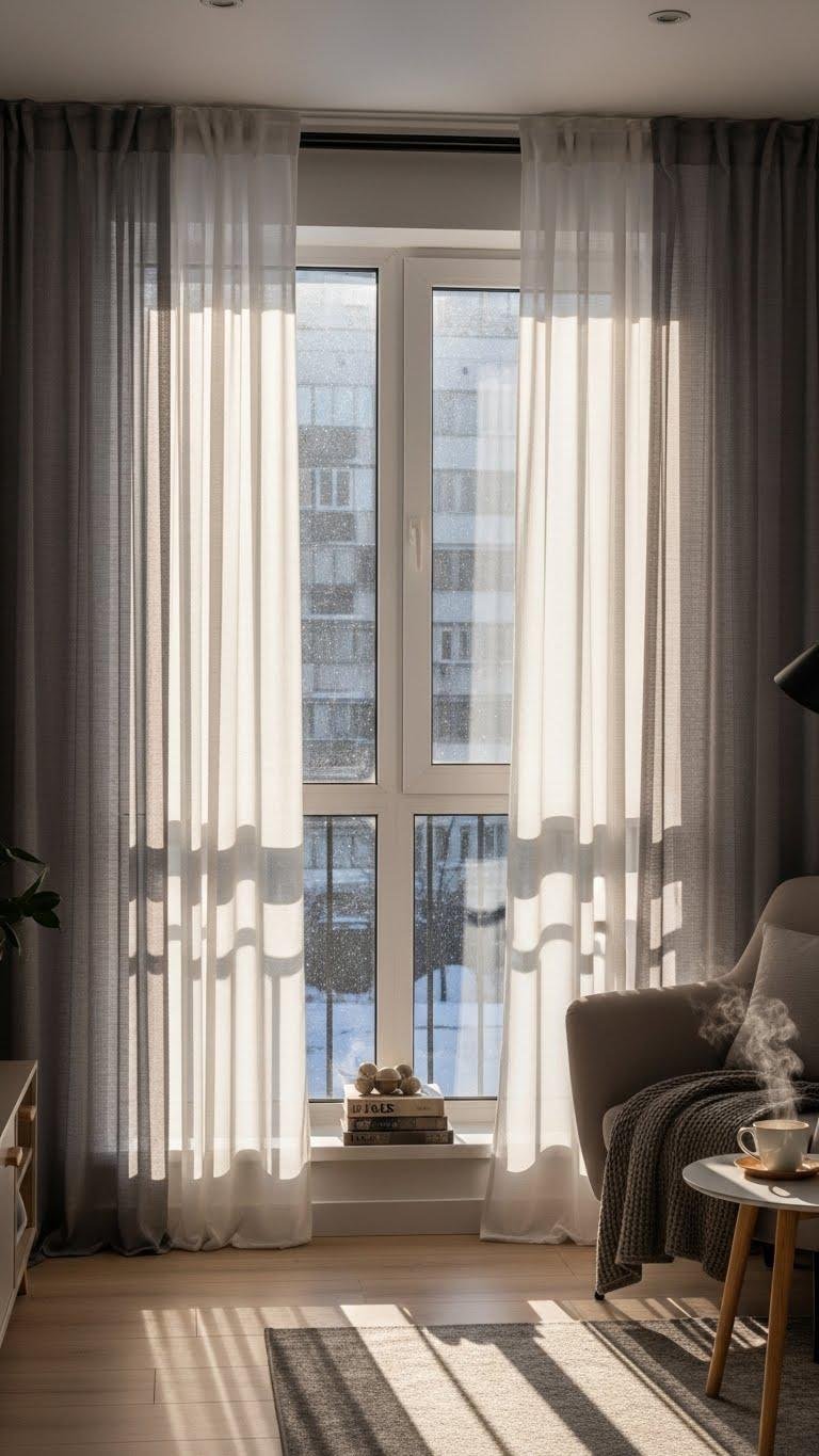 Often you’ll want to squeeze every ray of winter sun into a small apartment, and sheer curtains make that easy. You’ll position panels to frame windows, leaving warm windowpanes visible while translucent layering softens glare.