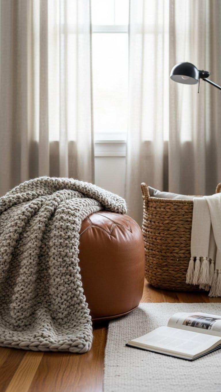 You’ll drop throws into woven storage that’s sculptural yet simple, freeing floor space and calming the room.