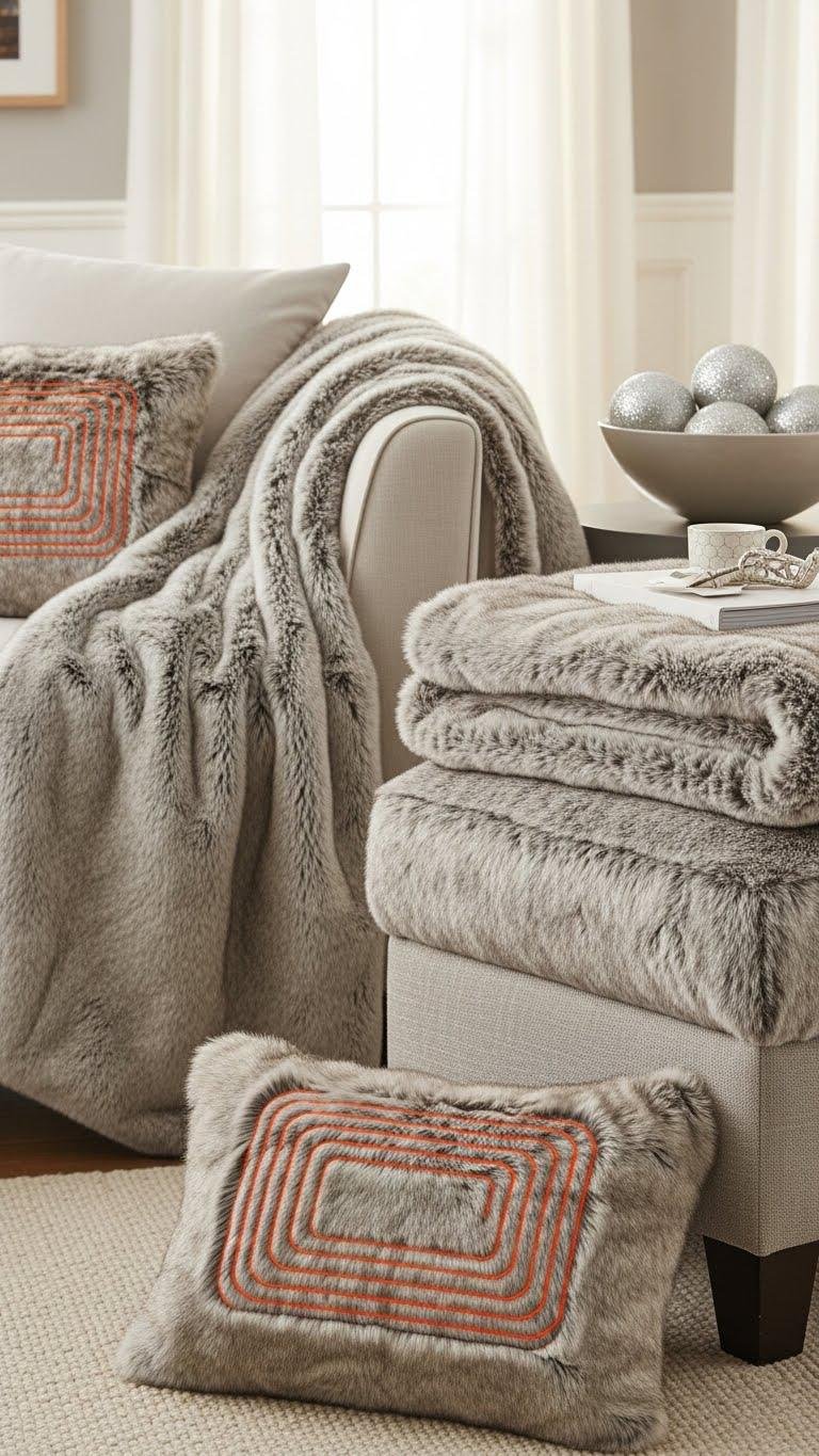 You’ll use chunky layered draping to create casual rhythm, folding one corner over the arm for effortless style. Choose a neutral weighted pairing—soft gray or cream—so the blanket reads airy yet substantial, giving freedom to curl up or spread out.