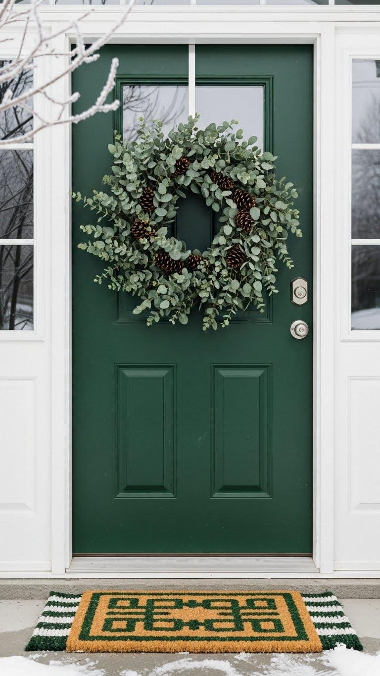 Hang an over-the-door wreath to add instant winter charm without taking up floor space. Choose wreath sizing that complements your door and nearby door matting so proportions feel airy, not crowded. Use a slim hook and lightweight materials—eucalyptus, pinecones, ribbon—to keep things simple.