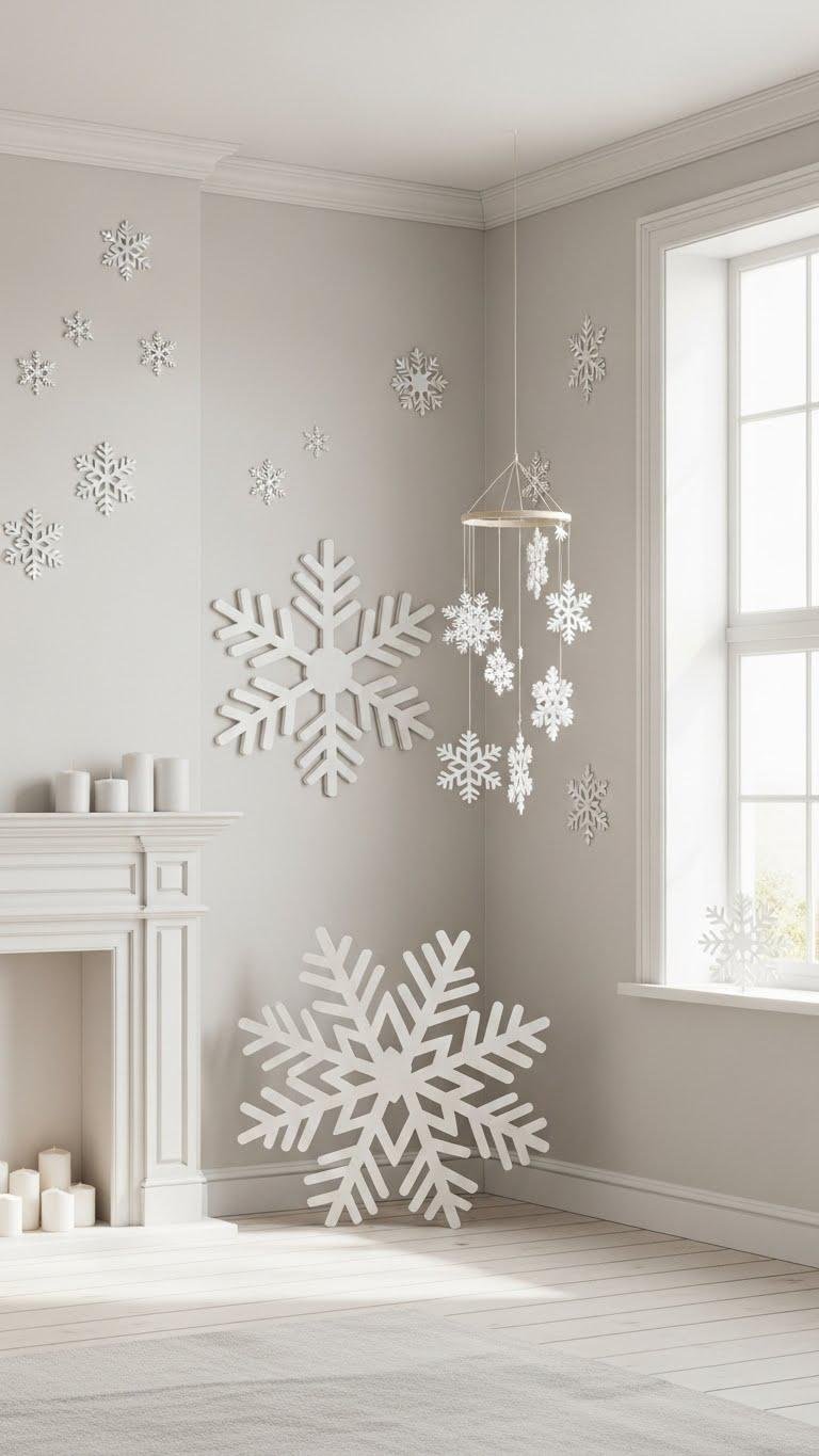 You’ll drape white snowflakes as subtle accents on walls, windows, or mantels, mixing small wooden cutouts with larger painted flakes for depth.