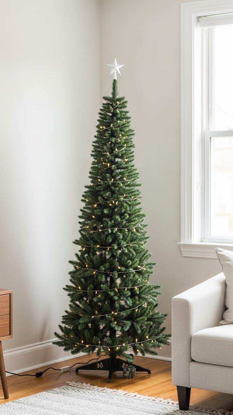 You’ll pick a mini table tree with a tapered silhouette to keep profiles clean and airy. Place it on a narrow console or floating shelf, decorate sparingly with tiny baubles or warm white LEDs, and enjoy seasonal charm that doesn’t weigh down your rooms.