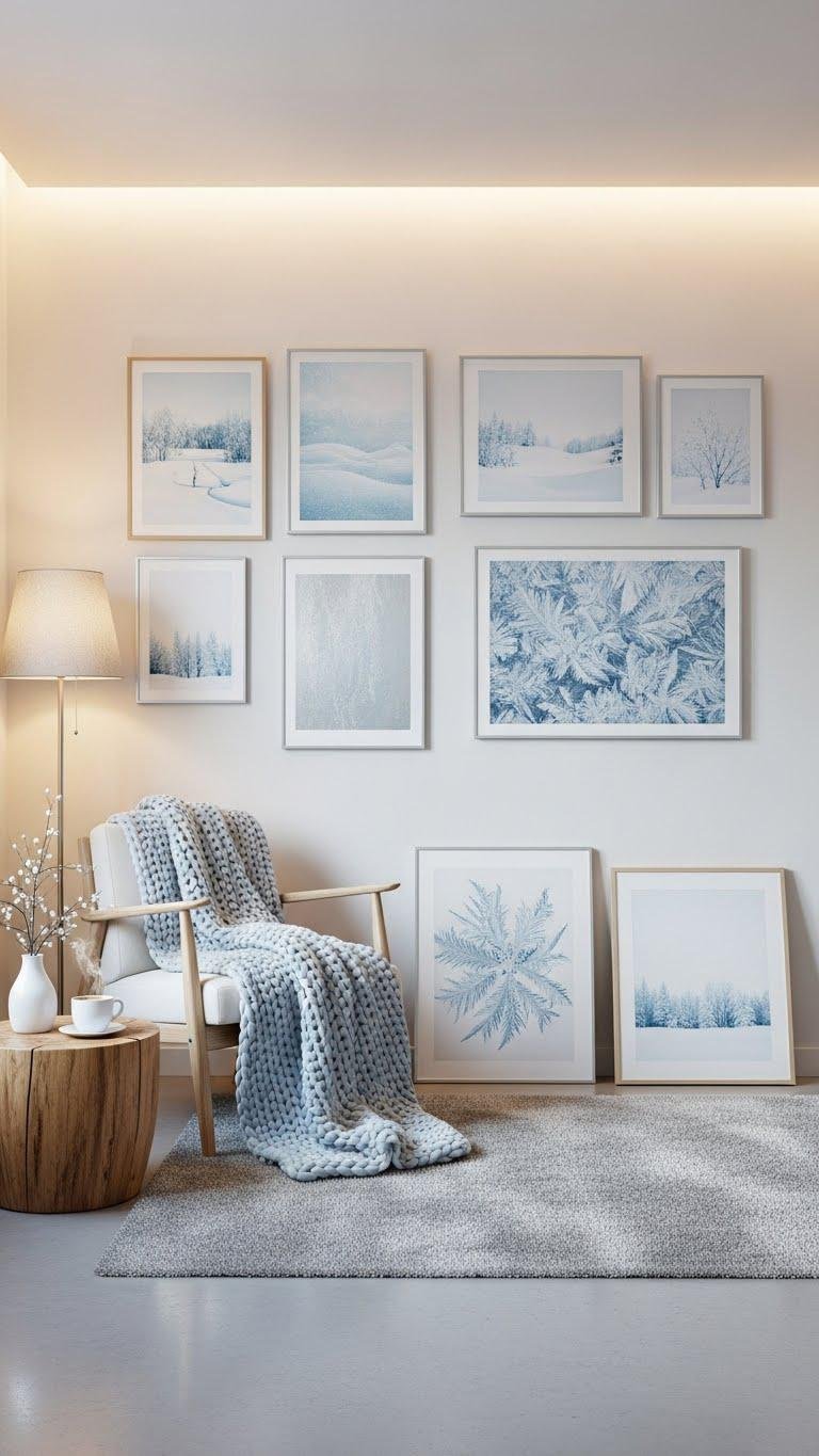 When the season shifts, swap out bright florals and summer landscapes for cool-toned winter prints to instantly change your room’s mood; you’ll get a crisp, cohesive look without rearranging furniture. Choose minimalist scenes, icy palettes, or abstract frost motifs.