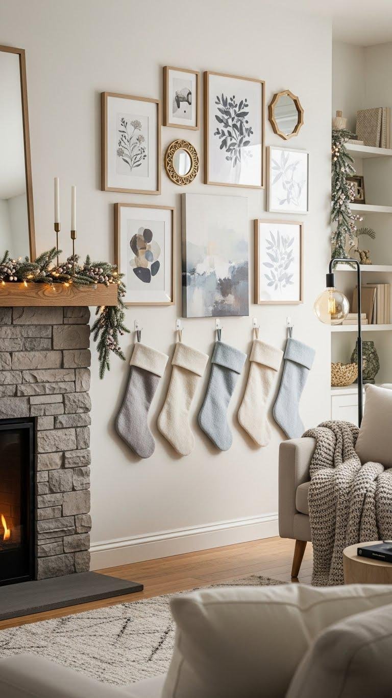 Swapping wall art is an easy way to set a winter tone, and you can extend that seasonal look by mounting slim stockings on discreet adhesive hooks—no nails, no heavy tools.