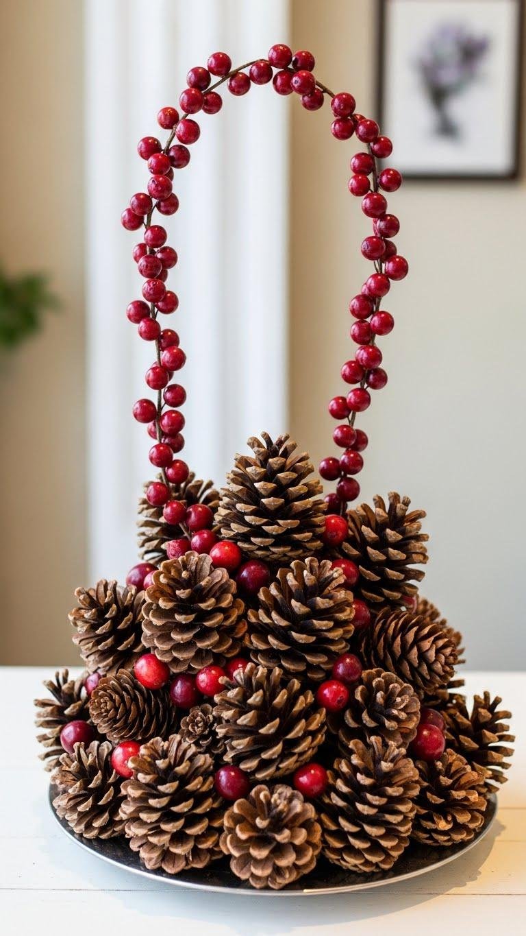 For a simple, natural centerpiece, cluster several pine cones of different sizes on a tray and tuck bright cranberries between them to add color and contrast. You’ll create a compact pinecone centerpiece that feels airy, organic, and deliberate. Add a short cranberry garland looped around the cluster for rhythm. Keep proportions small so the display breathes and won’t crowd your surfaces.