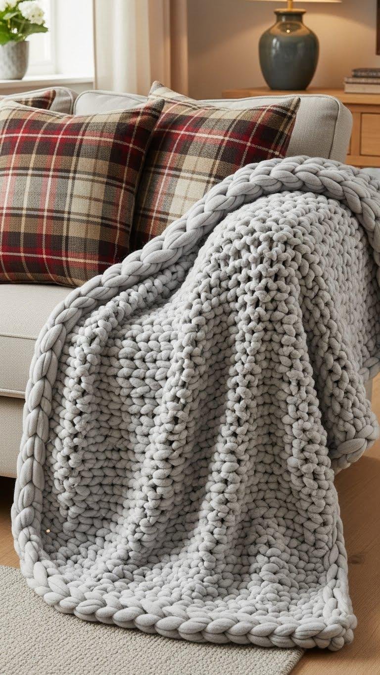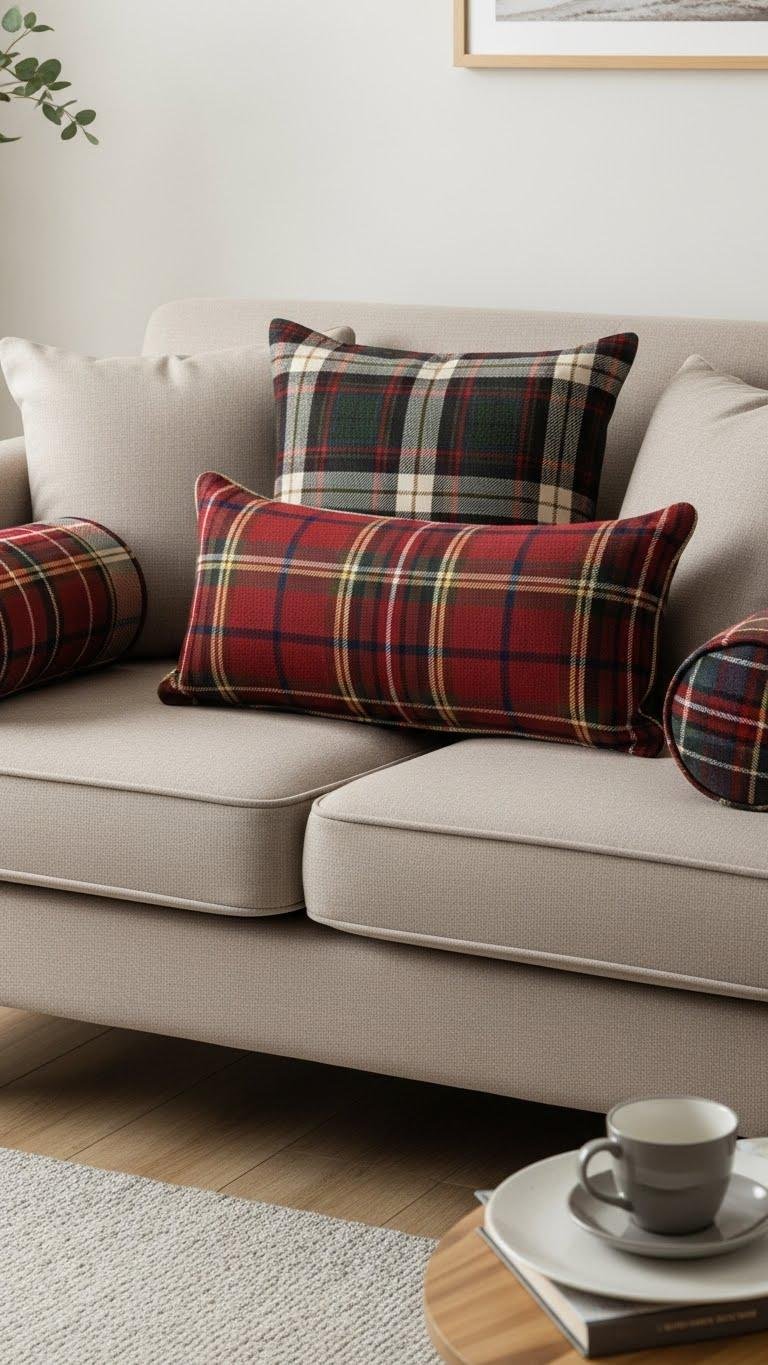 With your tartan pillows anchoring pattern, layer in a chunky knit blanket to boost texture and inviting warmth without crowding the sofa.