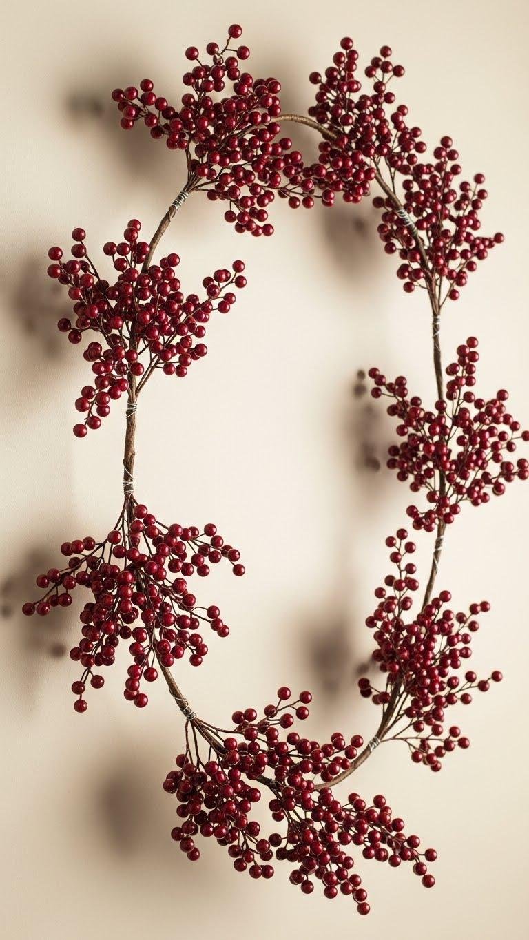 Tuck a few burgundy berry stems into your garland to add depth and a warm, sophisticated touch. You’ll stagger berry sprig placement along varied garland lengths, tucking stems into loops and securing with thin wire. Keep spacing deliberate so each cluster breathes, avoiding overcrowding. This lets the color read as intentional, elongating sightlines and giving your small space a liberated, curated feel.