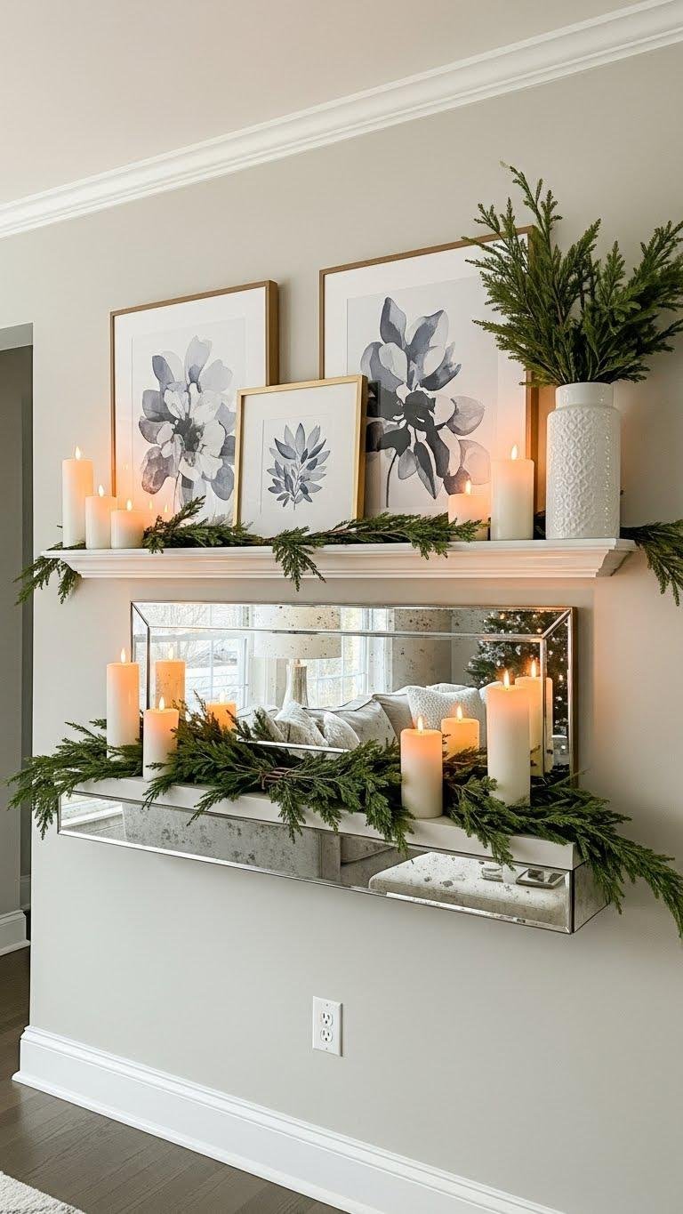 If you don’t have a real mantel, build a faux one to anchor a focal wall and add instant winter charm. Paint a slim shelf, mount it at fireplace height, and style it with candles, greenery, and art.