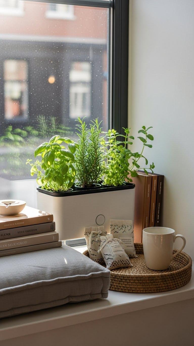 Bring your window to life by arranging a small vignette that balances light, texture, and function. You’ll place a compact heated planter for greenery, a low-profile cushion to lounge, and a stack of slim books.