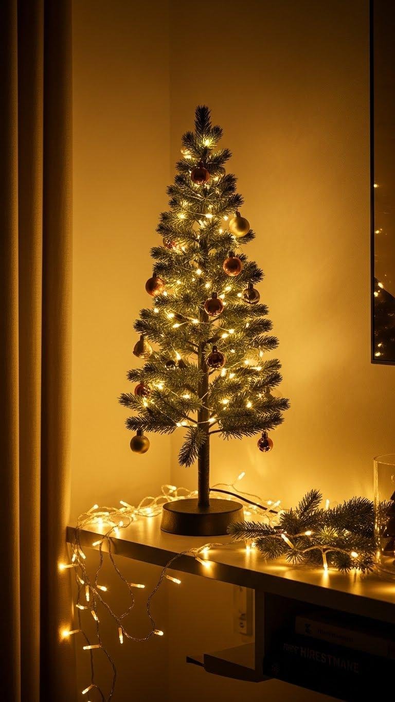 After the soft glow of string lights, a slim tabletop tree adds vertical interest without stealing floor space.