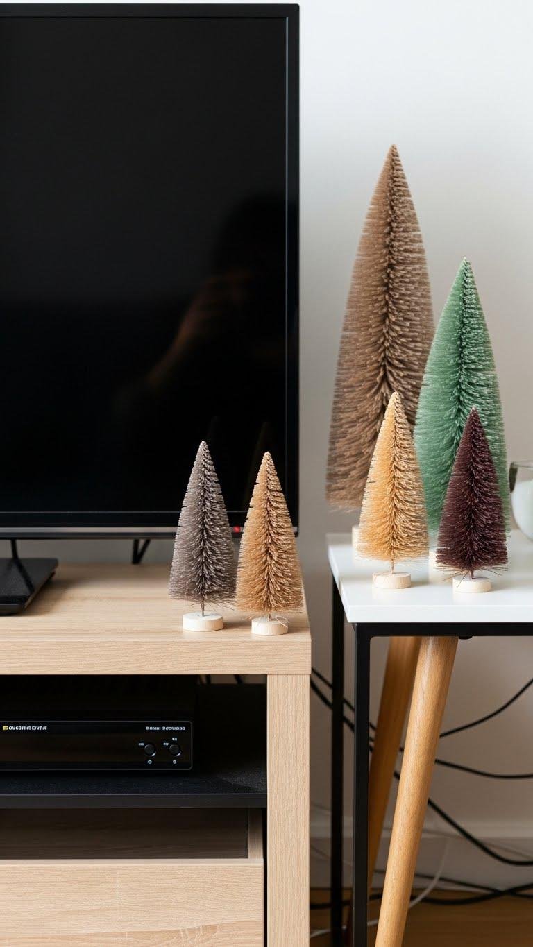 Tuck a few bottle brush trees beside your TV to add texture and height without taking up much room; their skinny profiles and muted colors complement screens and cable boxes while keeping the look tidy.