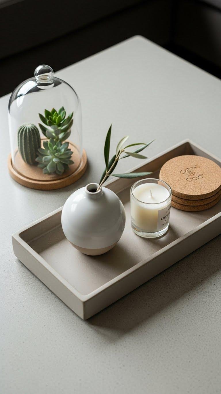 Corral clutter and create a focal point by arranging a simple tray vignette on your coffee table—choose a low-profile tray in a neutral tone, then add just three elements: a small ceramic vase with a single stem or sprig, a compact candle, and a stackable object like a tiny book or coaster.