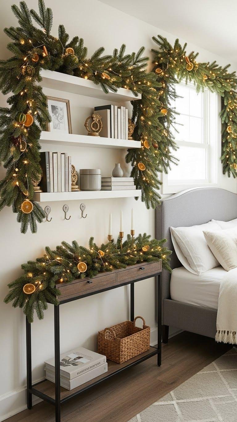 Bring a faux pine garland into your small space by draping it where a mantel would be—across a bookshelf, along a narrow console, or over a headboard—to add winter greenery without taking up floor space.