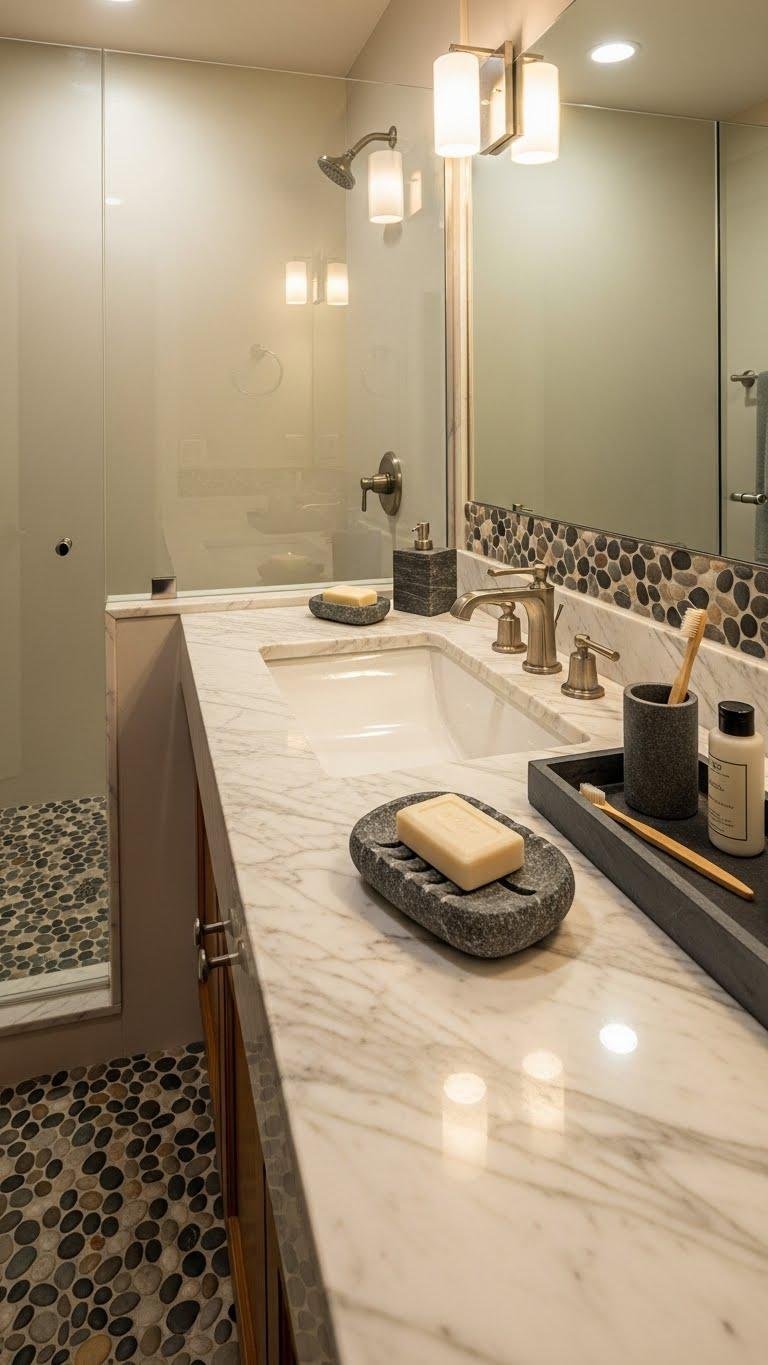 You’ll layer river pebble accents, slate trays for toiletries, and a simple stone soap to keep surfaces calm, durable, and effortlessly freeing.