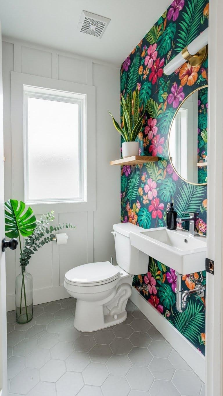 A bold floral wallpaper can transform a small bathroom into a signature space—choose a scale that complements your fixtures and limit the palette to two or three tones so the pattern reads like intentional art.
