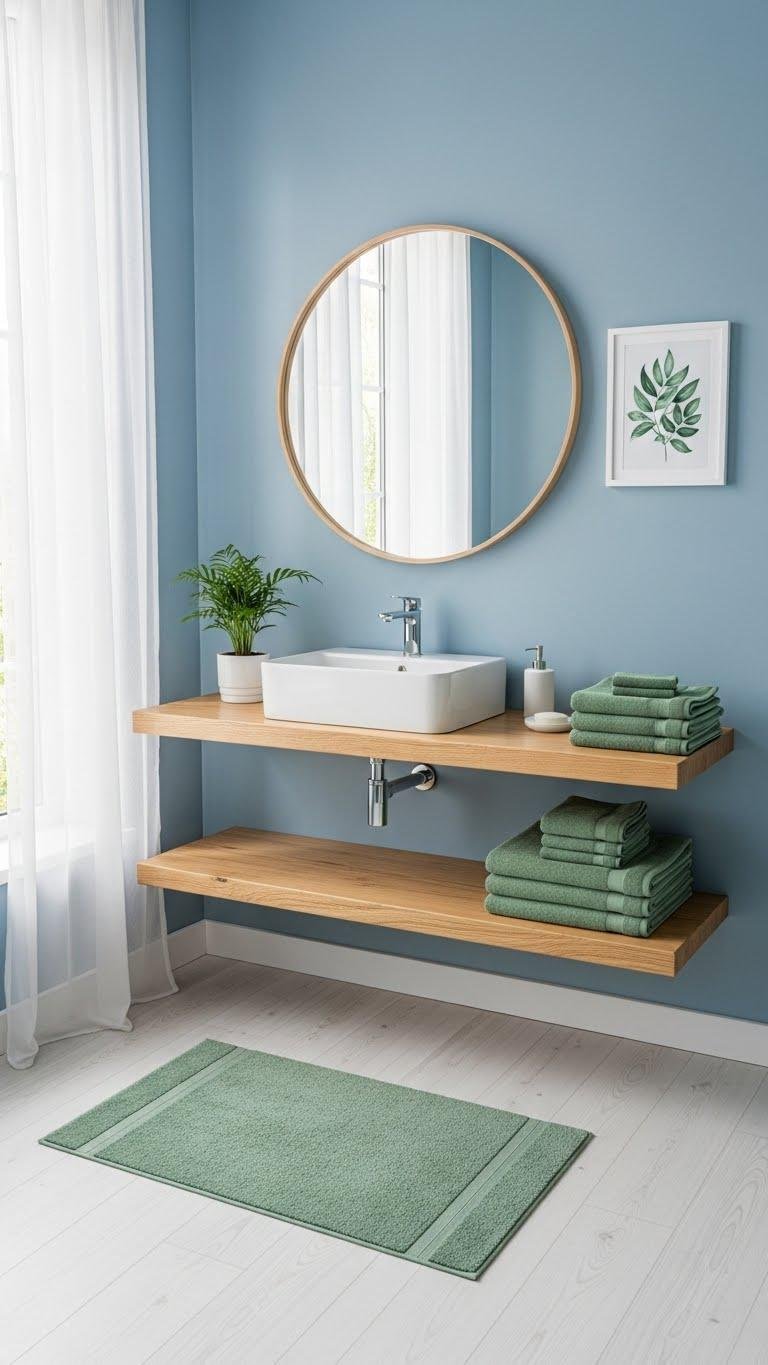 Bring in sage green and calming blues to ground your bathroom in nature-inspired serenity; these muted tones work together to soften bright light, highlight natural materials, and create a restful backdrop that feels both modern and lived-in. Choose sage textiles for towels and mats, pair with ocean hues on walls or accessories, and keep fixtures simple so you can breathe, unwind, and personalize freely.