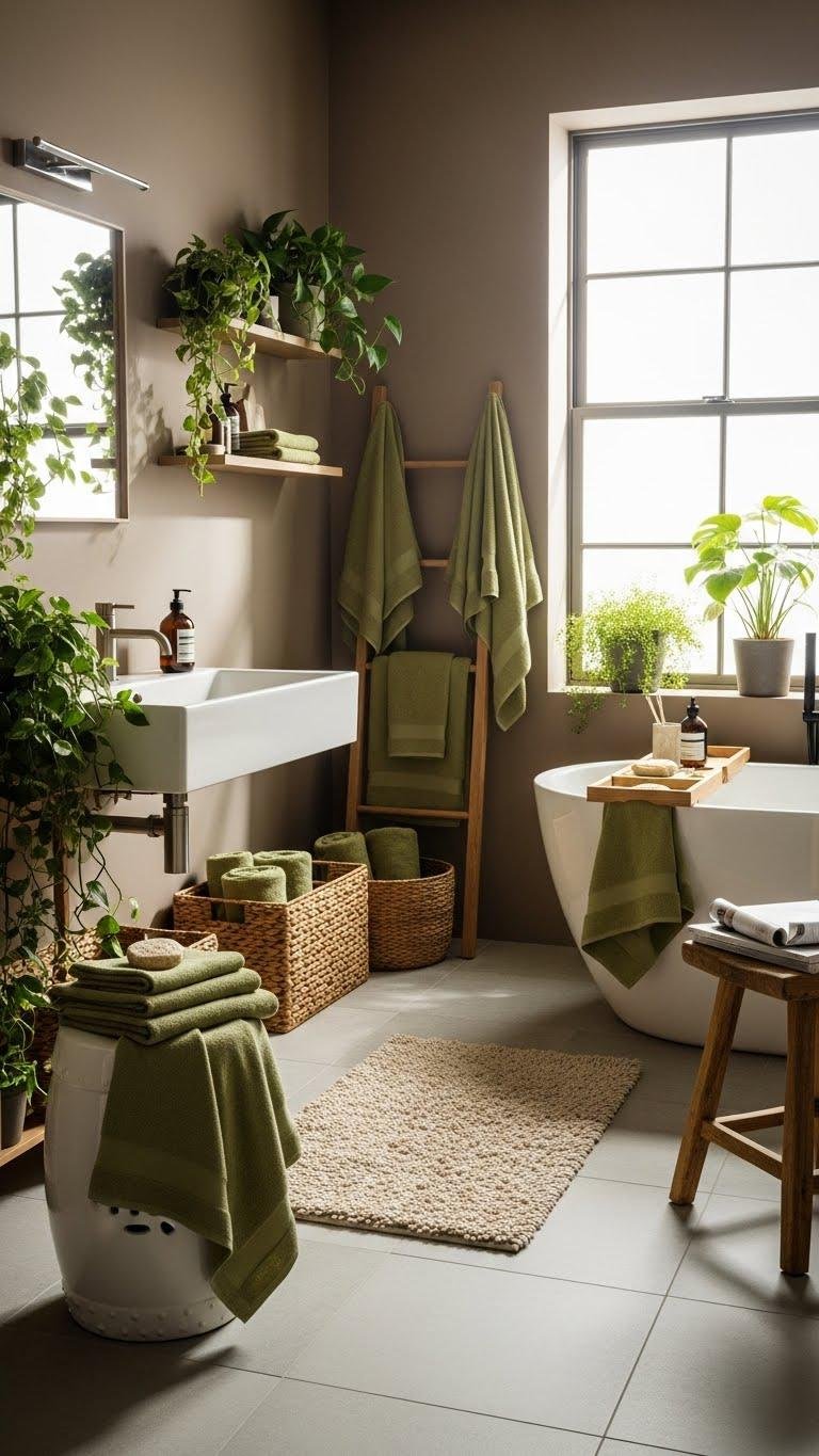 Choose a base of warm taupe and weave in khaki green accents to create a layered, cozy bathroom palette that feels grounded and sophisticated. You’ll mix earthy textures—linen, matte ceramics, woven baskets—with muted contrasts for depth. Keep fixtures simple, add a khaki towel or plant, and let natural light amplify warmth. This approach gives you serene freedom and refined calm.