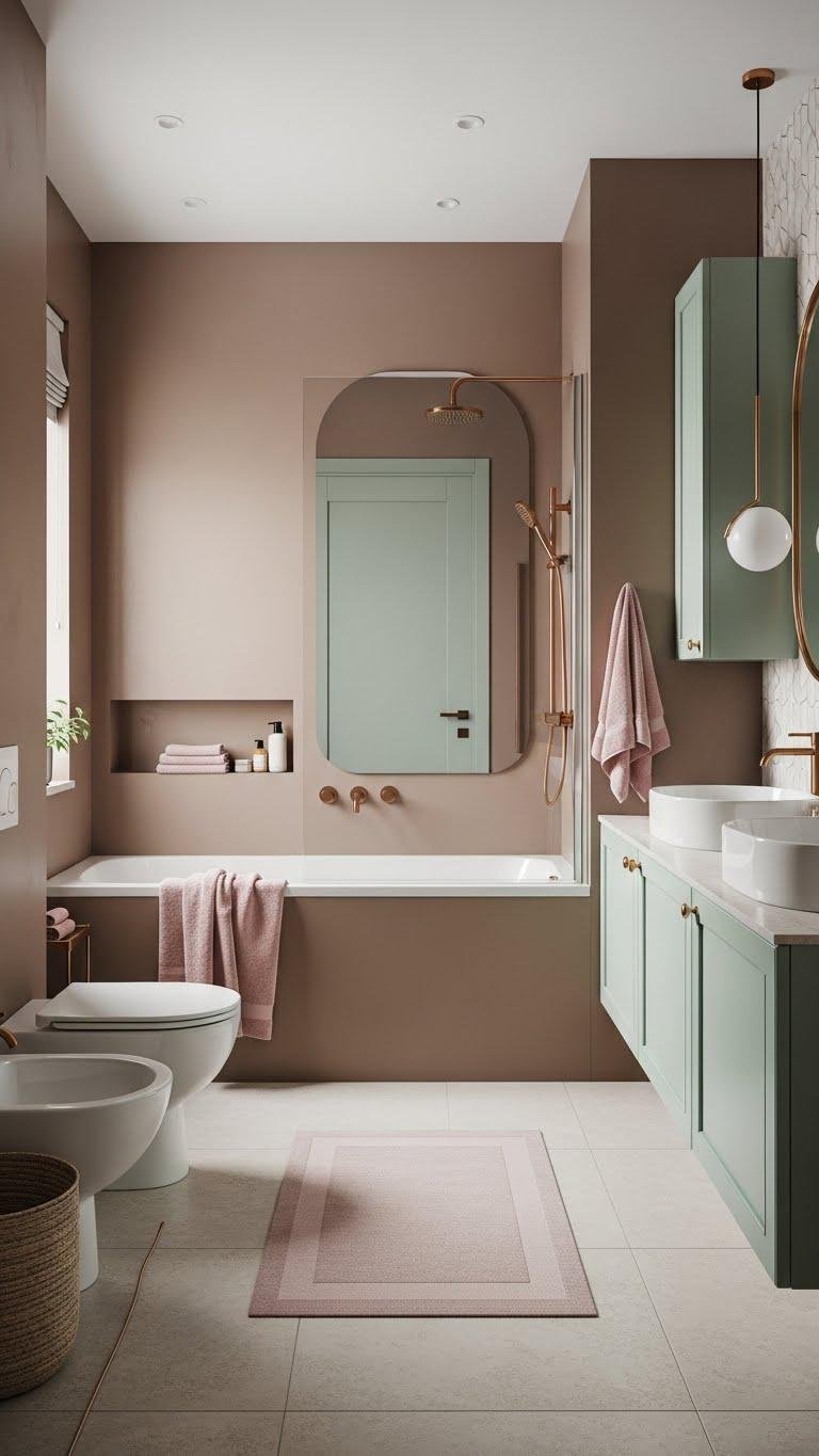 Several small accents in powder pink or mint green can lift your warm taupe and khaki palette without overpowering it. You’ll add tactile charm with powder pink towels and subtle accessories, or choose mint green cabinetry for a fresh, liberated feel. Mix matte finishes and soft textures, keep lines clean, and let those restrained pops create a calm, airy bathroom sanctuary.
