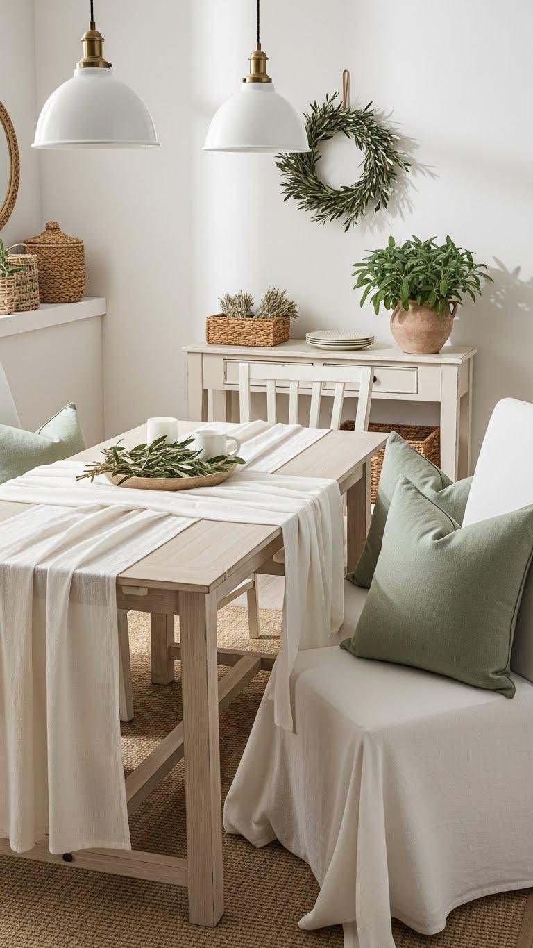 You’ll layer soft linen runners, cream-painted furniture, and textured baskets to keep things airy.