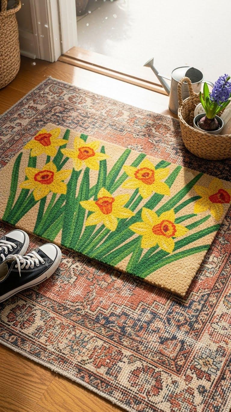 Layer a bright, washable spring doormat over a low-profile vintage rug to give your entryway instant personality and practical protection. You’ll mix layered textures for depth, pairing durable fibers with faded pattern and vintage charm.