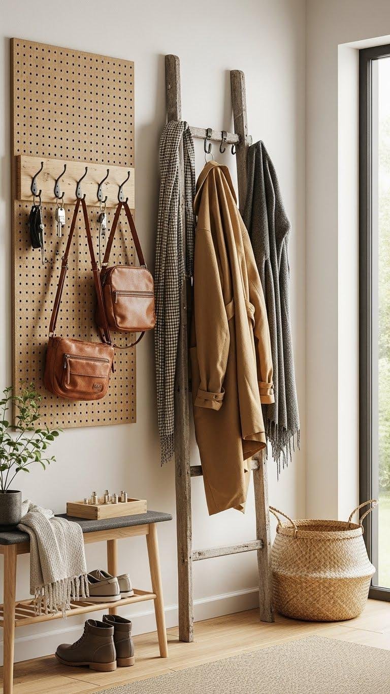 Choose a rustic pegboard or mount hooks on a reclaimed ladder to create flexible hanging zones for coats, bags, and scarves. You’ll keep clutter down, express a relaxed, liberated aesthetic, and enjoy durable, low‑fuss functionality that fits evolving seasons and needs.